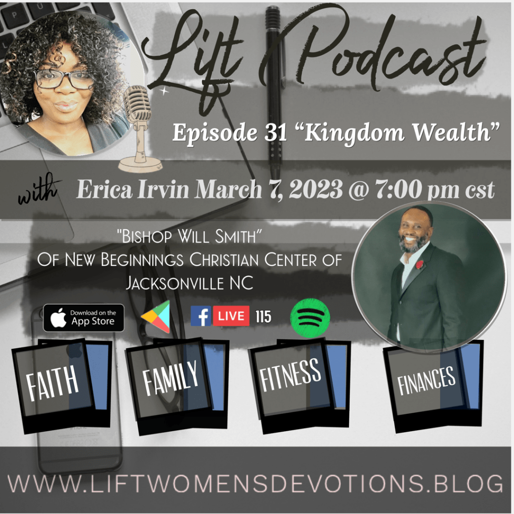 Episode 31 “Kingdom Wealth” 03/7/2022 Posted byLift Women’s DevotionsMarch 7, 2023November 9, 2024Posted inPodcast Episode 31 In this Episode Bishop Will Smith shares his story and journey to wealth and prosperity. Save the Date for Tuesday, March 7, 2023, at 7:00 pm cst. 8:00 pm est. You can also tune in on Facebook Live “Lift Devotions Page. Share this: Share on X (Opens in new window) X Share on Facebook (Opens in new window) Facebook Like Loading...