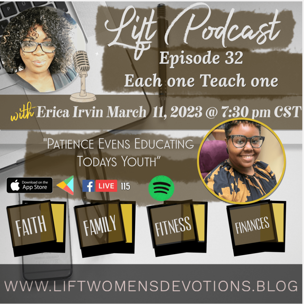 In this Episode Patience Evens shares her passion for learning and educating young minds. This pre-recorded episode aired on Tuesday, March 14, 2023, at 7:00 pm cst. 8:00 pm est. You can also tune in on Facebook Live “Lift Devotions Page, iTunes, and Google Play.